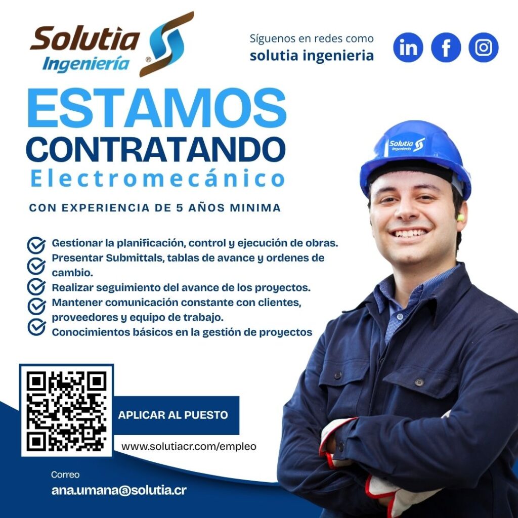 En Solutia, buscamos talentos apasionados por la ingeniería electromecánica, que deseen formar parte de un equipo comprometido con la innovación, la calidad y el crecimiento continuo.