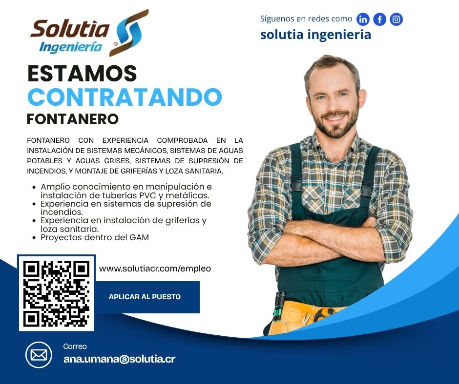 Ayudante de Fontanero – Solutia Ingeniería Descripción del puesto: Buscamos un Ayudante de Fontanero con conocimientos básicos y experiencia en la construcción de sistemas mecánicos. La persona apoyará en la